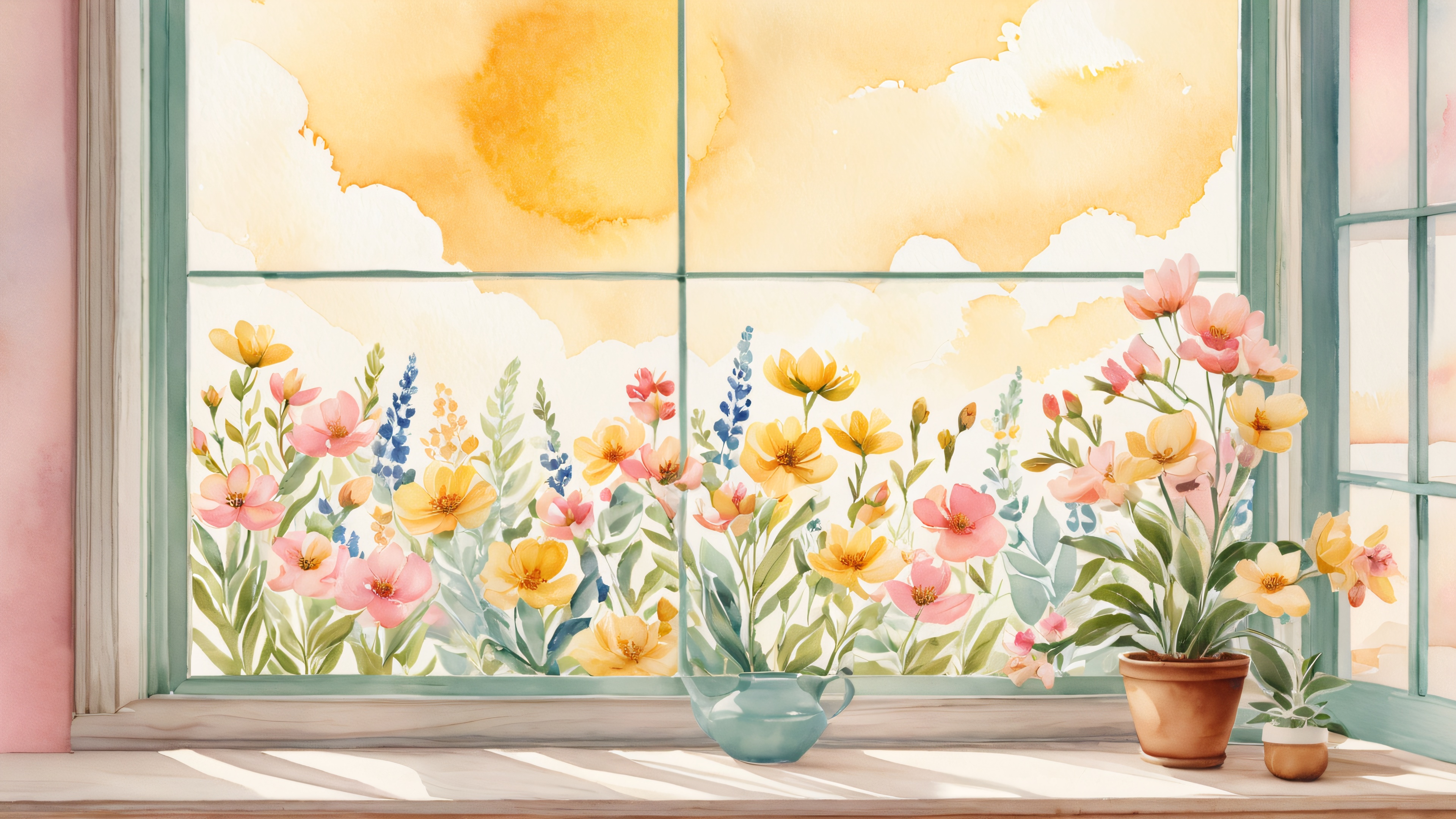 This stunning 4K wallpaper features a whimsical, hand-painted-style watercolor illustration of flowers in various colors and shapes, gently swaying in a soft breeze. The delicate blooms are set against a warm, sun-kissed wooden background with intricate grain patterns and subtle scratches, adding a touch of rustic charm. The soft, diffused natural light with gentle highlights and warm undertones simulates a sunny afternoon, casting a cozy atmosphere.