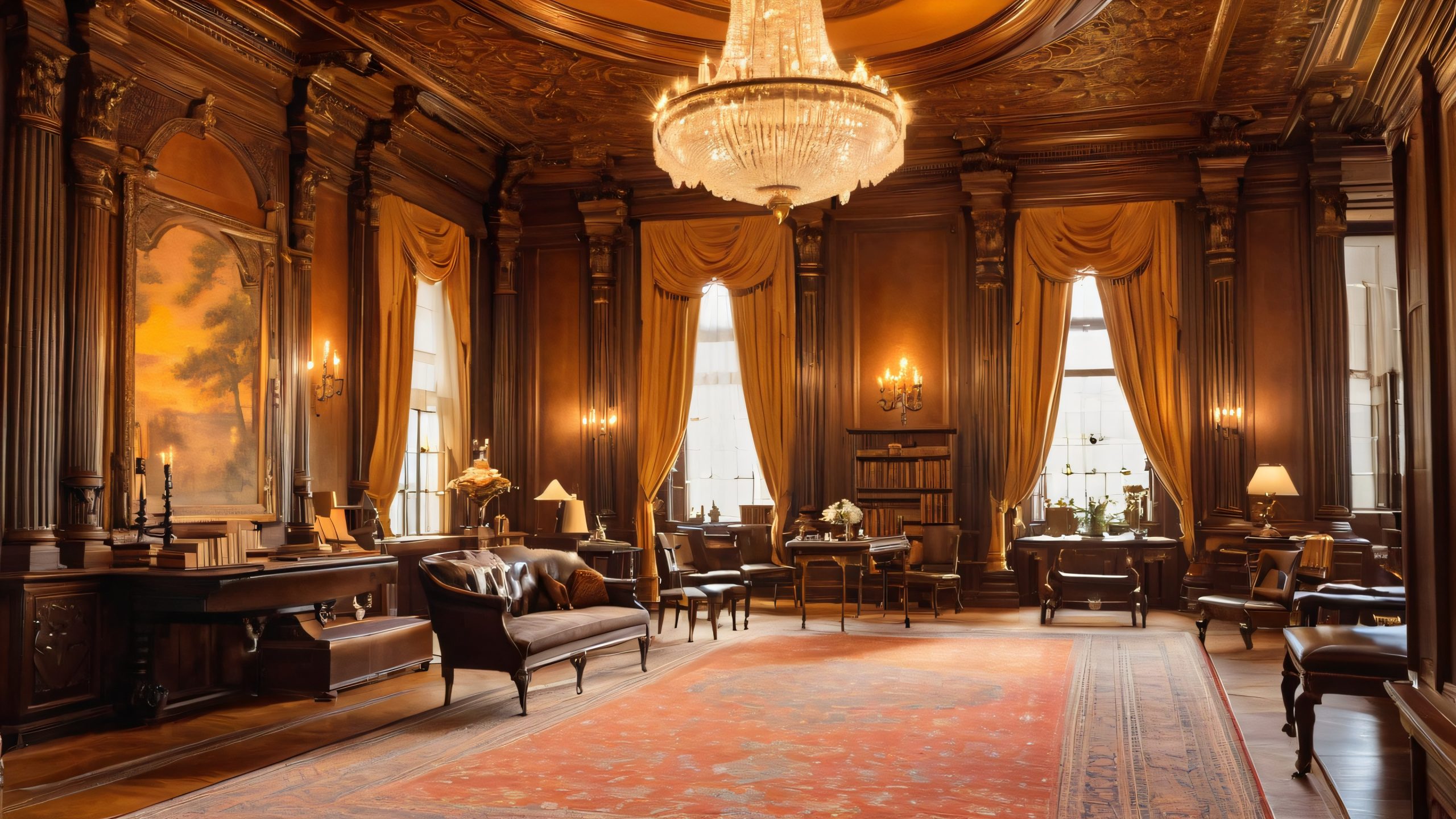 This stunning 4K desktop wallpaper transports you to a grand, high-ceilinged library with intricately carved bookshelves, plush carpet, and warm, golden lighting. Soft, muted brushstrokes and subtle texture evoke an oil painting-inspired aesthetic. Rich browns, deep blues, and warm golds dominate the scene, with hints of crimson and sepia adding depth and mystery.