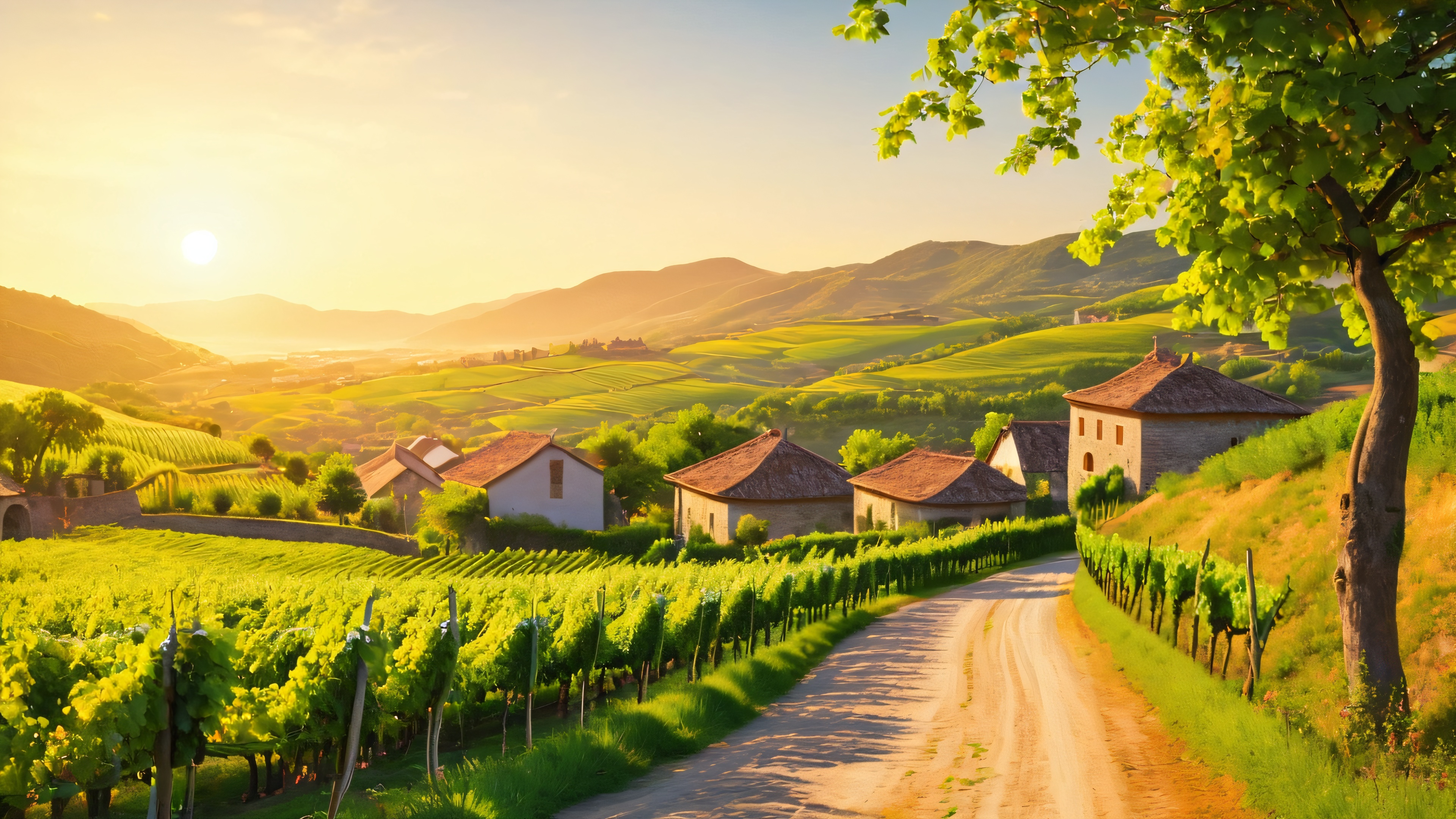 This stunning 4K desktop wallpaper showcases a picturesque vineyard landscape with undulating hills, a distant village, and the warm glow of sunset casting a golden light. The scene is characterized by intricate textures, subtle brushstrokes, and soft, golden light with long shadows and a hint of warmth. The dominant earthy tones of green and gold are accented with hints of crimson and amber, creating a masterpiece of natural beauty.