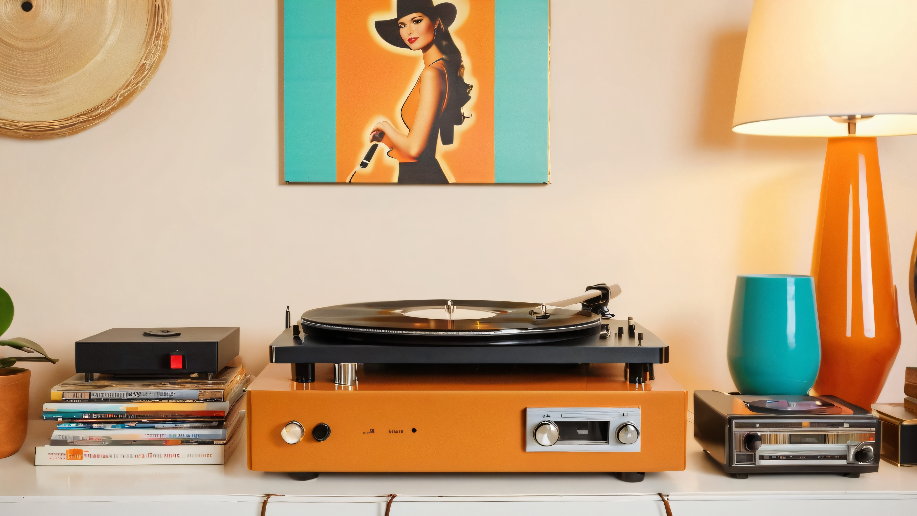 Cozy living room with friends gathered around a vintage record player and nostalgic memorabilia, perfect for a desktop/PC background.