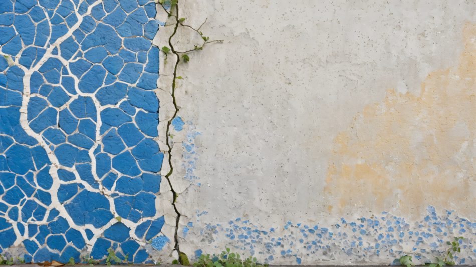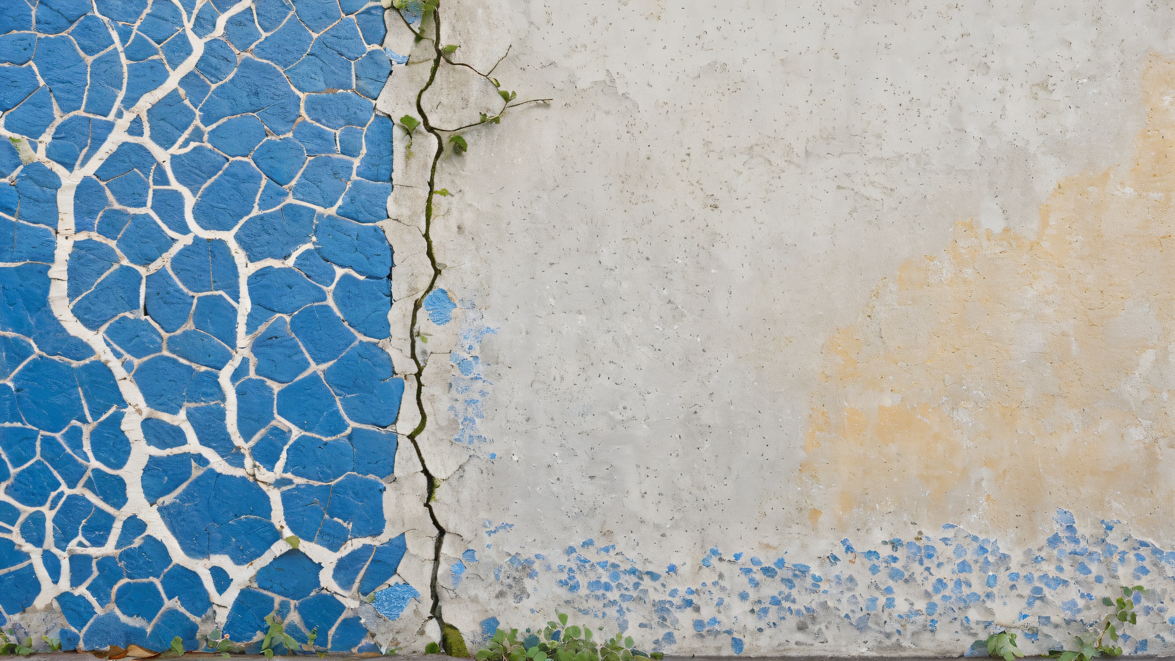This stunning 4K wallpaper features a macro-captured, hyper-realistic concrete wall with textured cracks and fissures, weathered to a soft, matte finish, with subtle sheen suggesting the gentle caress of morning dew. The desolate, post-industrial urban landscape in the background features crumbling brick facades overgrown with vines and moss, with a hint of misty atmosphere. Soft, diffused natural light with a subtle golden glow from the rising sun casts long shadows, accentuating the tactile quality of the concrete. Dominant shades of blue and white with subtle undertones of beige and grey evoke a sense of worn, weathered beauty.