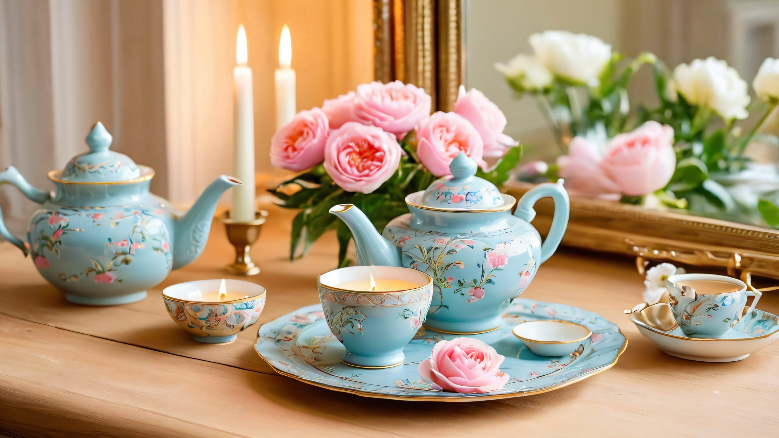 This stunning 4K wallpaper showcases a beautifully crafted ceramic tea set, adorned with intricate patterns of pastel pink and baby blue. The delicate pieces are set against a warm, beige-colored, distressed wooden table, surrounded by antique-style books, a vase of fresh flowers, and softly lit candles. The scene is bathed in a gentle, golden glow, as if the candles and tea set are radiating a comforting warmth. The subtle texture and gentle brushstrokes evoke a sense of watercolor-inspired realism, making this wallpaper a cozy and inviting addition to any desktop.