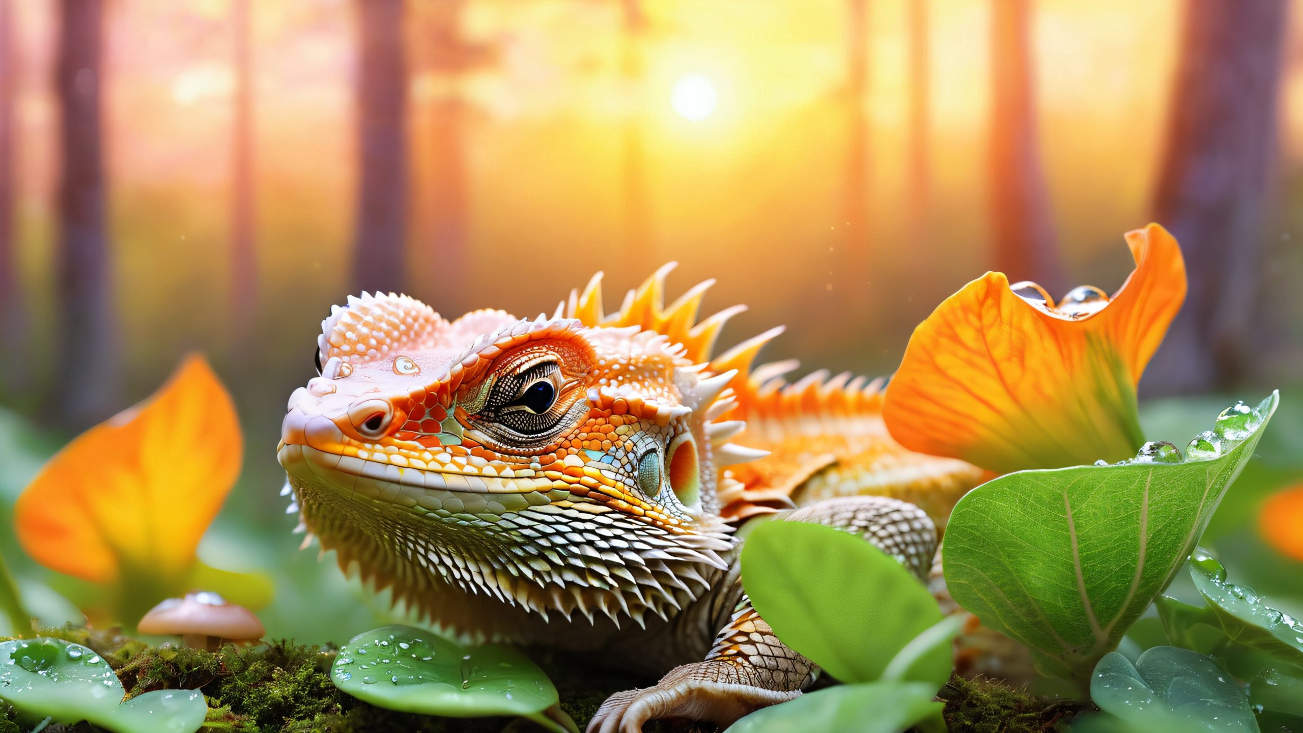 Serene desktop wallpaper featuring a Central Bearded Dragon named Mr. Punkin sitting on emerald green leaves, surrounded by a mystical forest glade, with ancient trees, glowing mushrooms, and sparkling dew droplets.