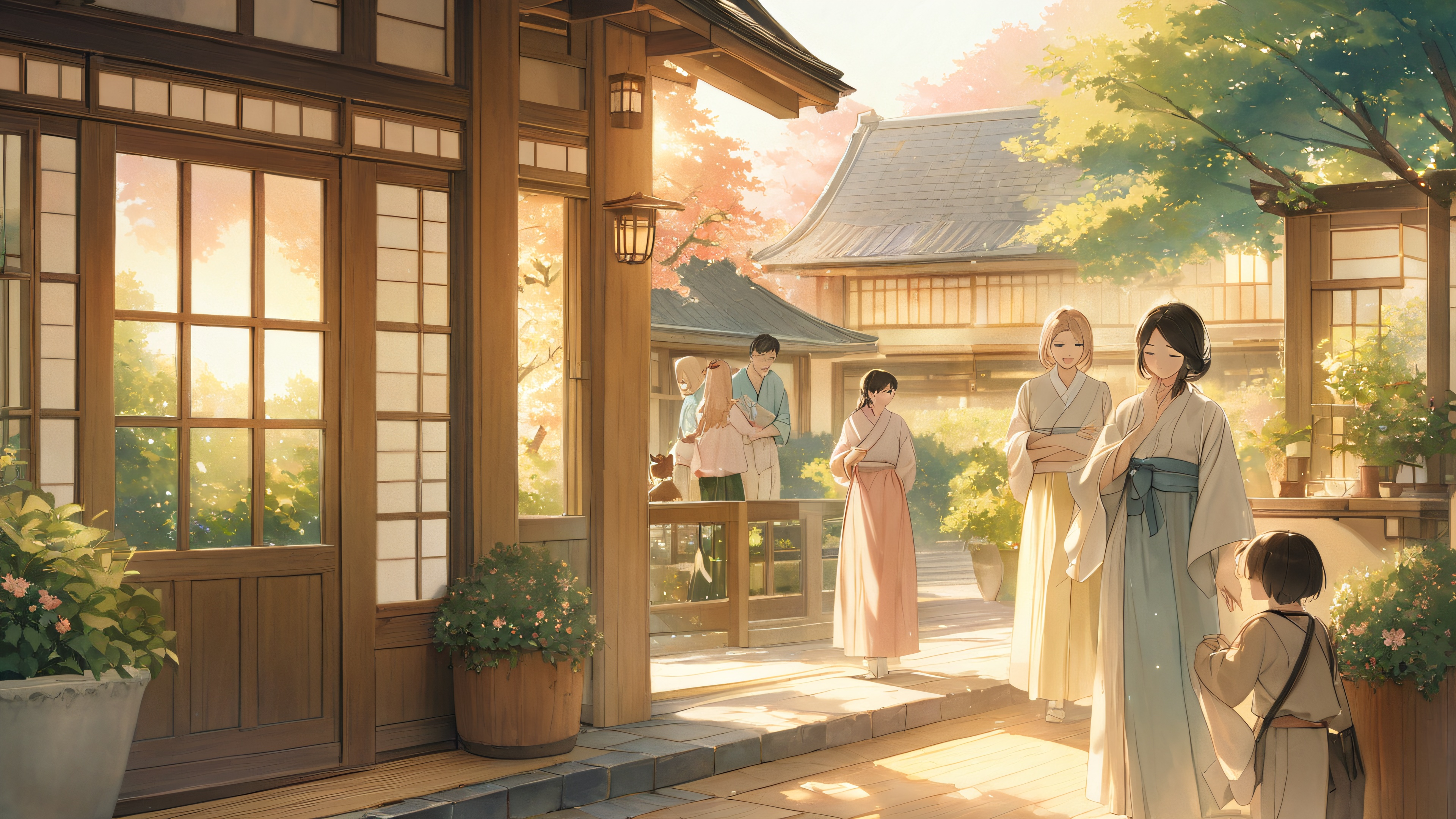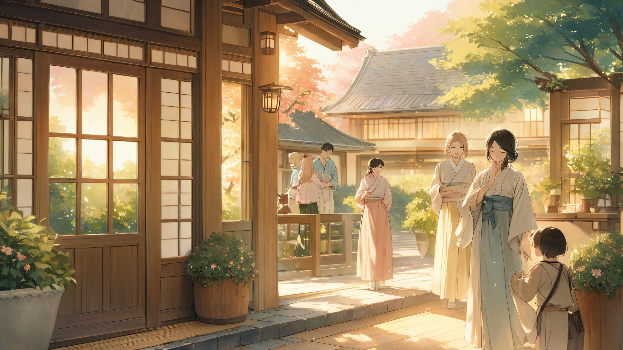 This breathtaking scene depicts the Yamada family going about their daily routines, filled with warmth and laughter. The soft, warm sunlight filters through the windows, casting gentle shadows and highlighting the family’s joyful moments. Delicate lines and subtle textures evoke a sense of nostalgia and warmth, blending traditional Japanese elements with modern touches.