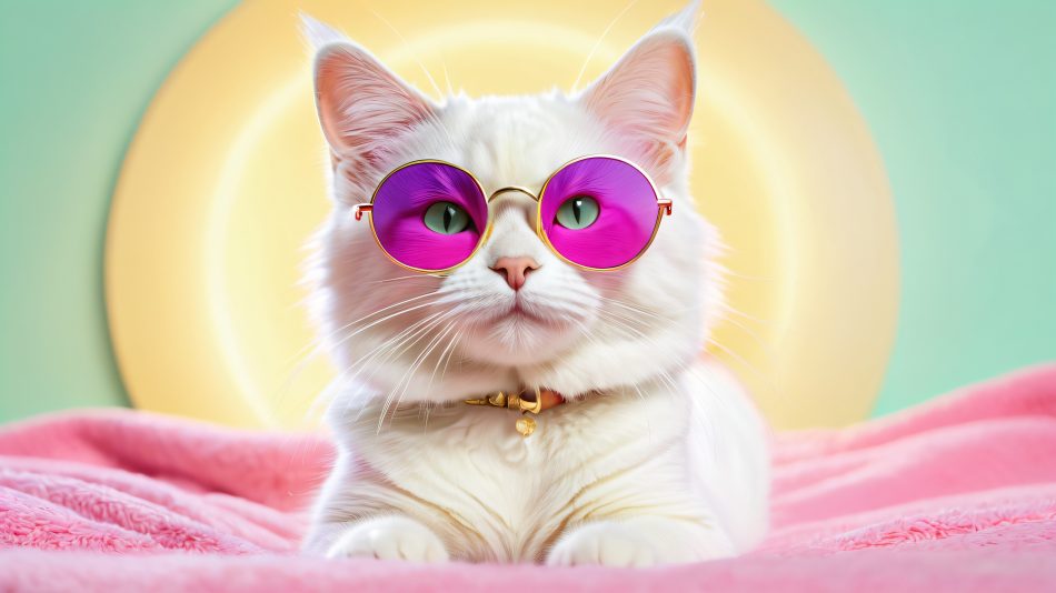 A stunning, high-definition scene featuring a kawaii cat with a sassy expression, sporting oversized neon cat ears reminiscent of 80s-style sunglasses. Her pastel pink, lavender, and mint green fur is meticulously rendered with subtle shading and texture, giving her a soft and plush appearance. The warm, intimate setting features a plush cream-colored background resembling a vintage bedspread, with a sense of comfort, playfulness, and curiosity. The scene is bathed in a gentle, golden glow, with subtle highlights and shadows accentuating the cat’s features and the whimsical nature of the scene.