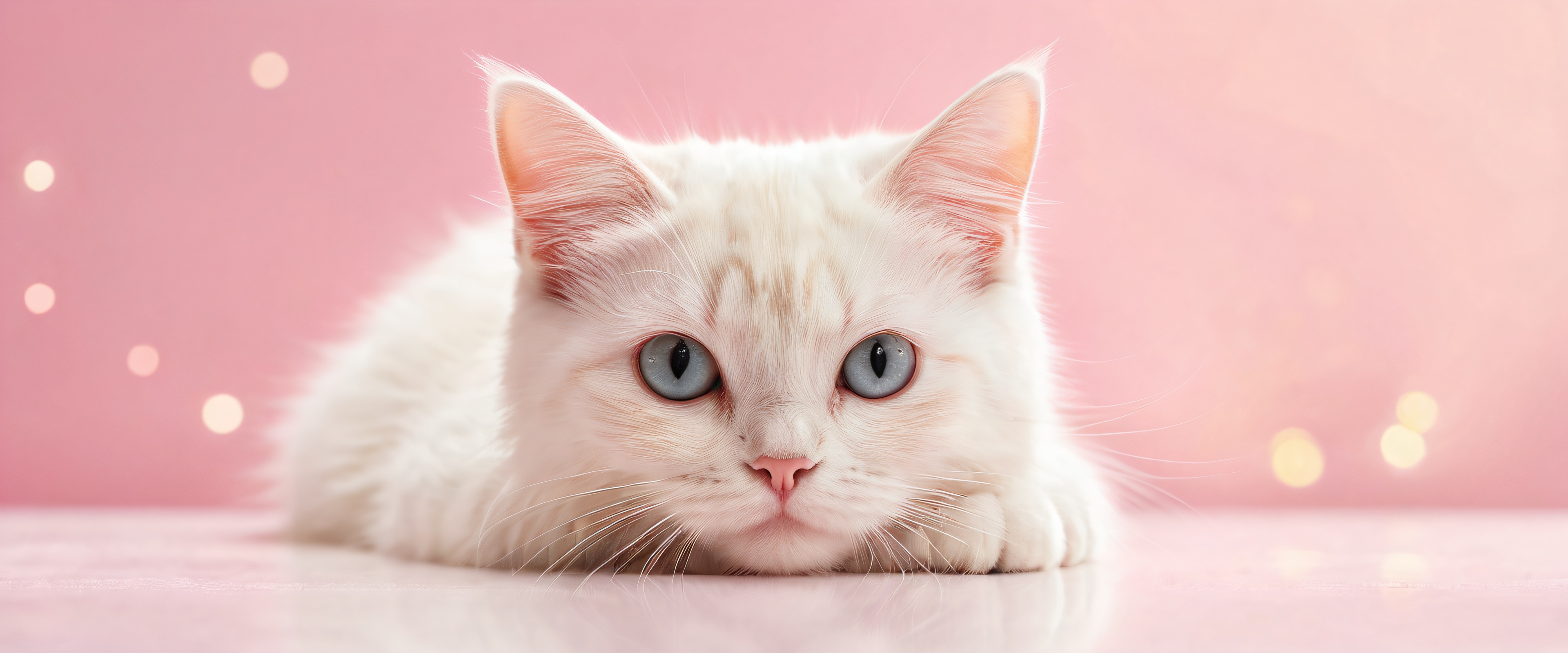 A breathtaking desktop wallpaper of Cat, Perfectly clean vast pure void, extreme depth of field, whimsical, Award-winning digital art, pristine clarity, vibrant colors, playful, Ethereal lighting: Radiant, brilliant colors, ray traced reflections, and pristine clarity. Bright and airy., [‘Pastel pink’, ‘Creamy white’, ‘Soft beige’], 21:9 ultrawide panoramic aspect ratio, epic wide shot, ethereal lighting, radiant, brilliant colors, ray traced reflections, pristine clarity, award-winning digital art, epic breathtaking scale, stunning visual impact, perfect composition, highly textured surfaces, intricate micro-details, physically based rendering, macOS wallpaper aesthetic, masterpiece, highest quality, highly detailed, 8k resolution.