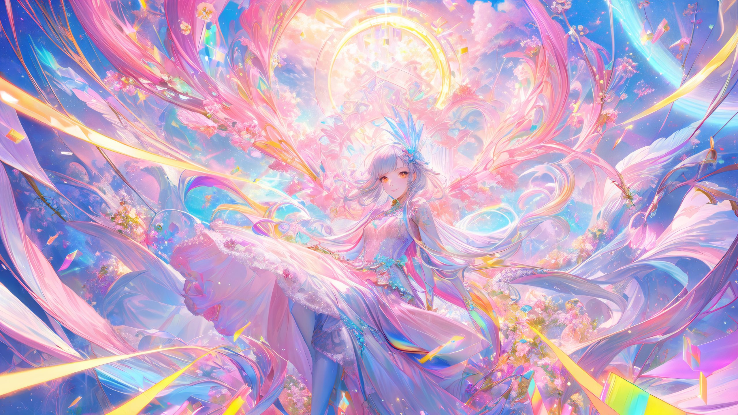 This stunning 4K wallpaper features Miw, a captivating Kawaii-inspired robot, amidst a surreal landscape of swirling clouds, vintage video game cartridges, and delicate, lace-like wires. The scene is bathed in warm, inviting light, with a palette of bright, pastel colors and metallic silvers. The intricate details and textures evoke a sense of digital wonder, making this a unique and captivating addition to any desktop.