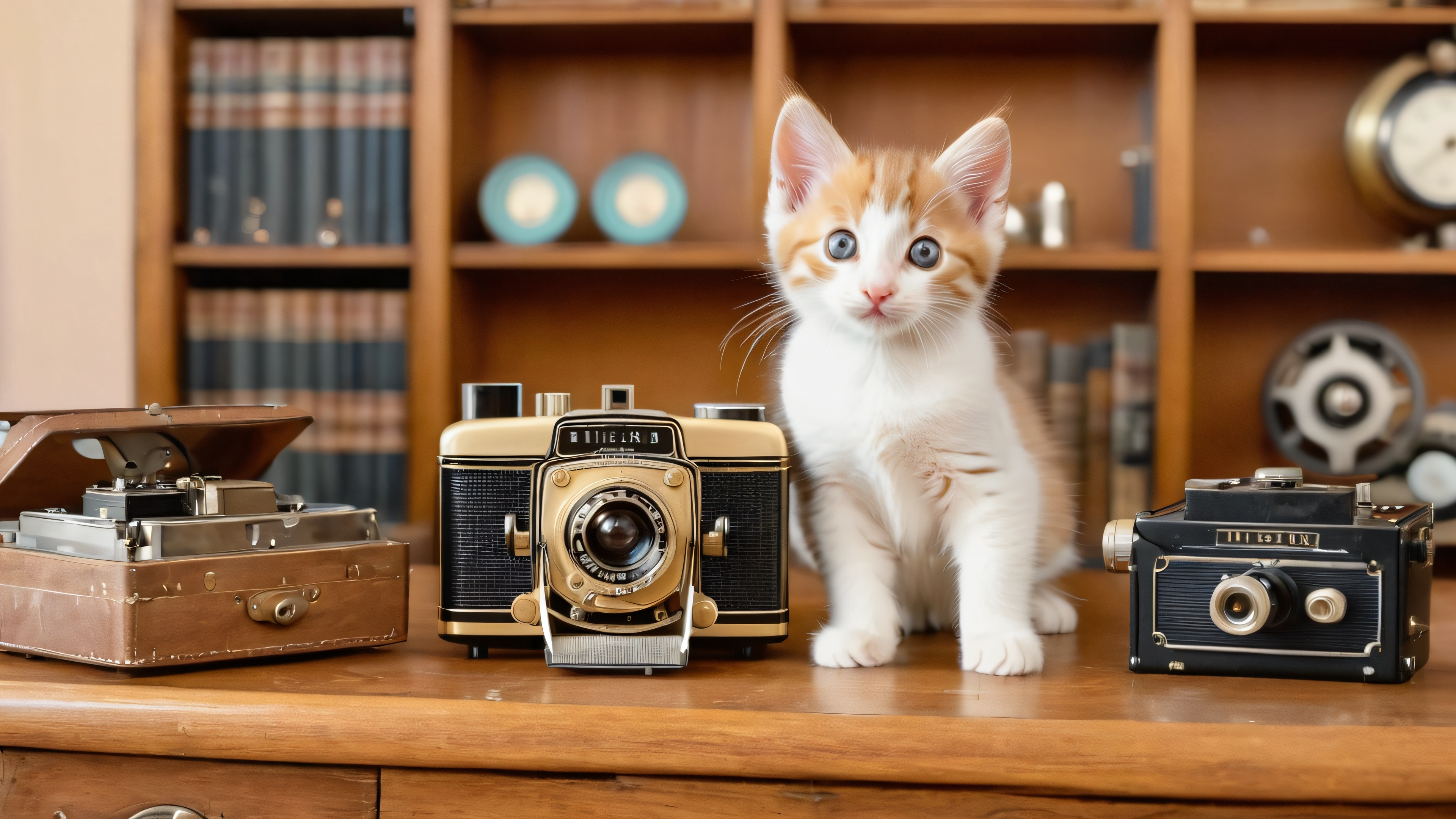 A curious kitten explores a vintage camera surrounded by old film rolls and gears, in a whimsical study with wooden shelves and antique equipment