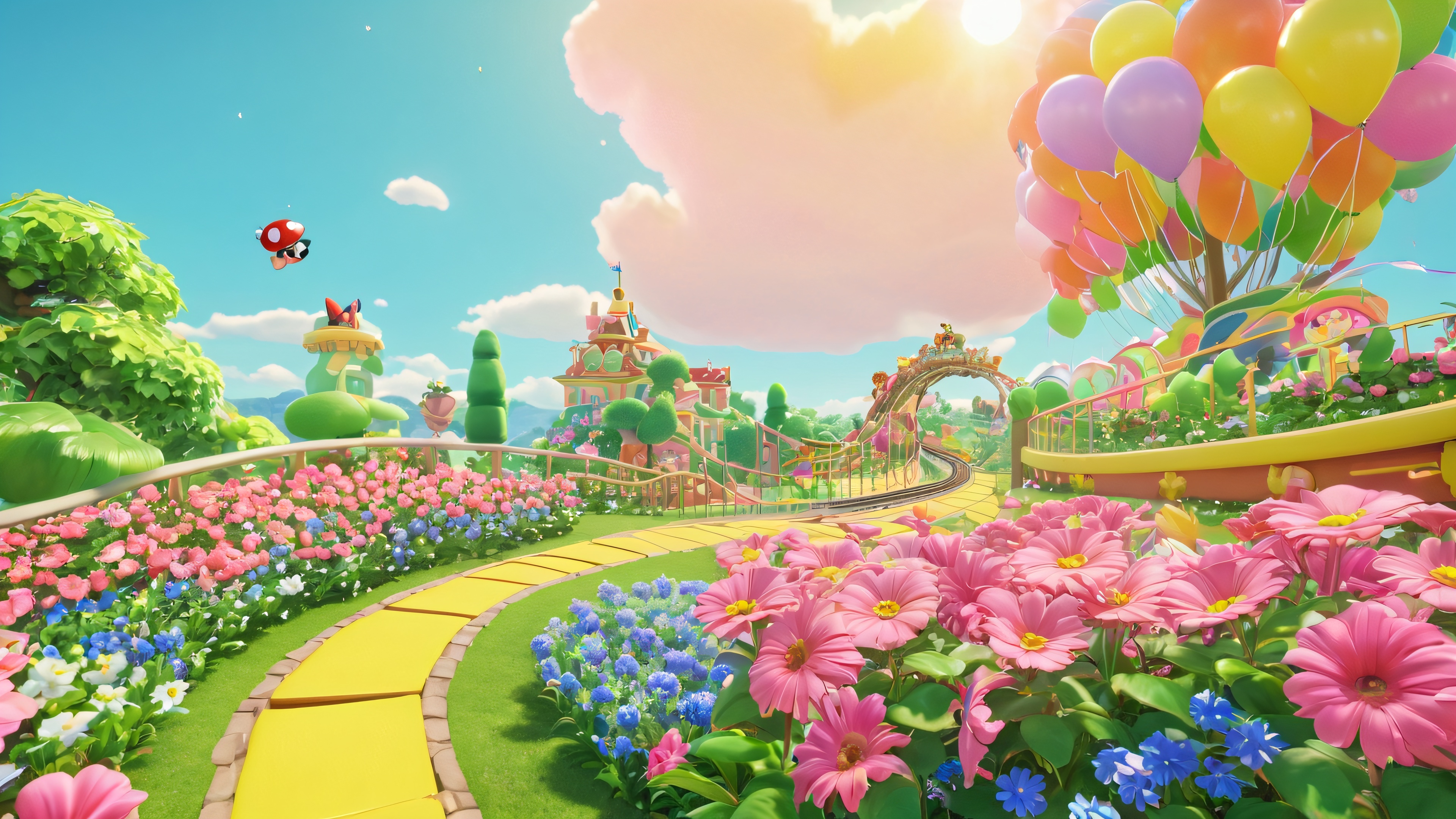 This stunning 4K wallpaper transports you to a vibrant, nostalgia-tinged world where rolling hills, towering trees, and lush flora evoke a sense of joyous celebration. Whimsical character illustrations of Mario’s friends, like Luigi and Princess Peach, are scattered throughout the scenery, surrounded by colorful flowers and winding roller coaster tracks. The scene is bathed in soft, warm sunlight with subtle highlights on the characters’ smiling faces, adding to the overall sense of magic.