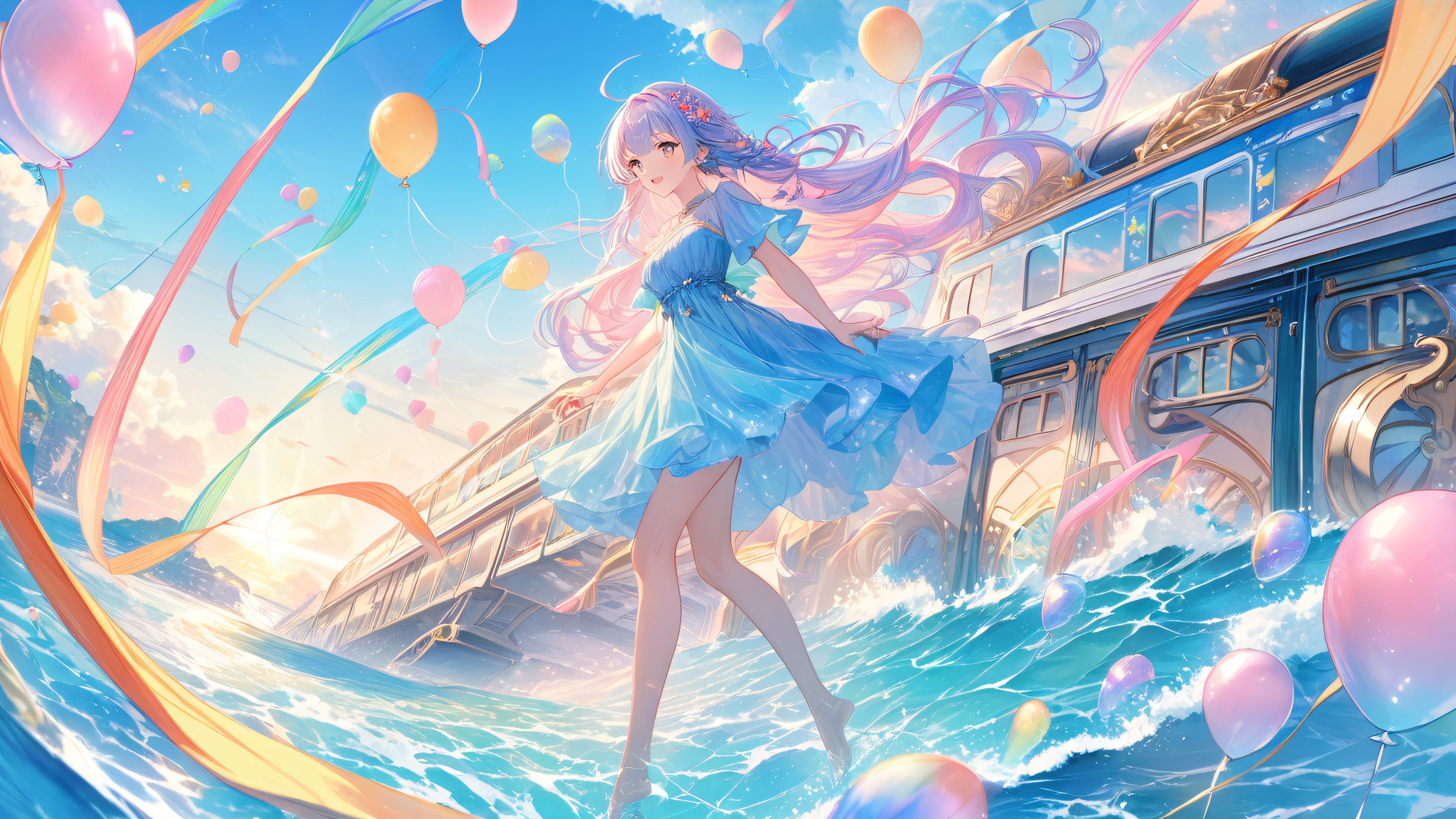 The image features a whimsical anime train, adorned with colorful streamers and fluttering heart-shaped balloons, chugging along the coast of a shallow ocean. The train’s cars are designed to resemble giant seashells, complete with swirling patterns and iridescent sheens. The scene is set against a serene coastal backdrop, with sandy shores, gently lapping waves, and a horizon that meets the sky.