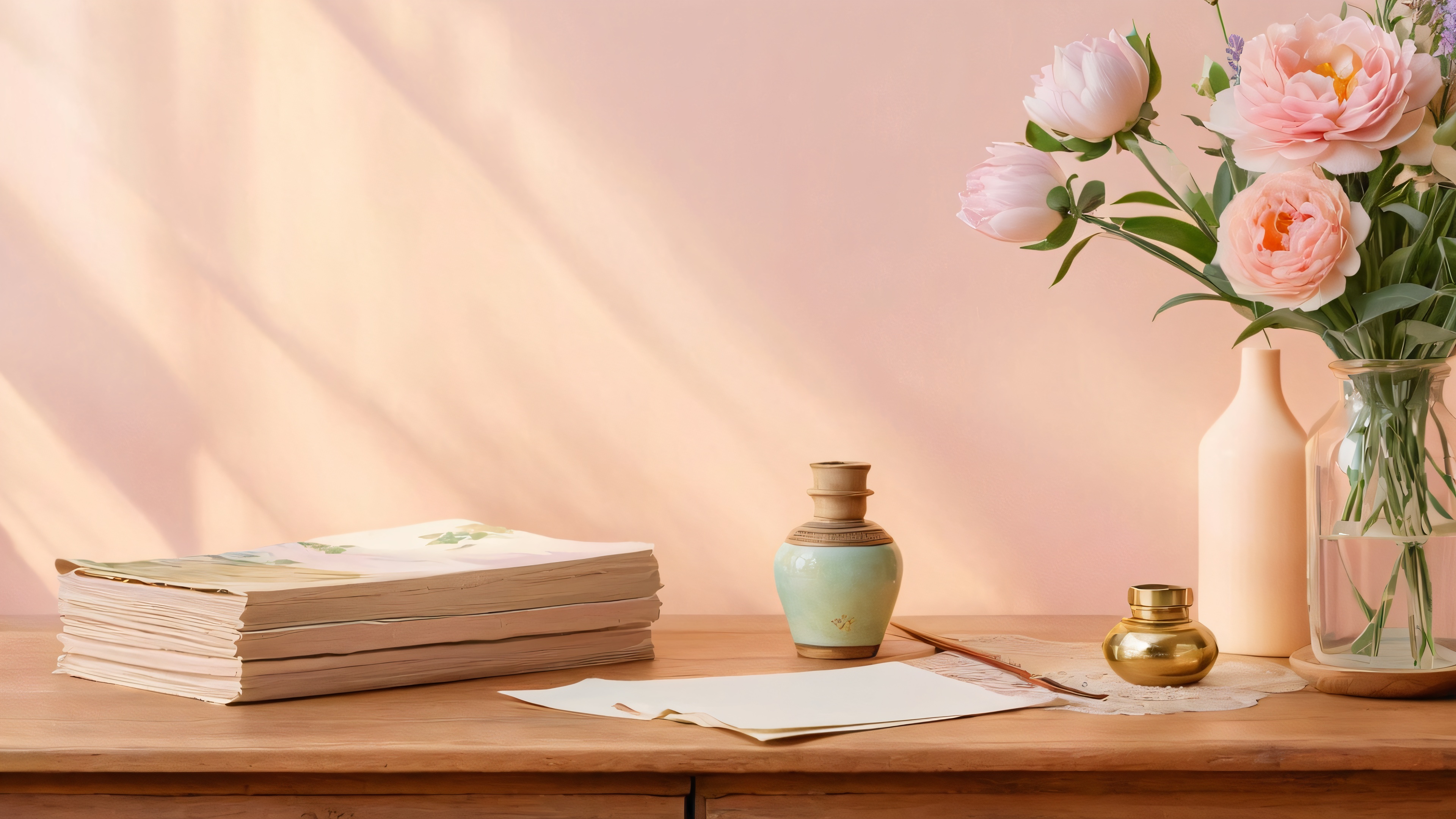 Whimsical Study: Vintage Desk Scene with Paper Flower Wallpaper Free Download: