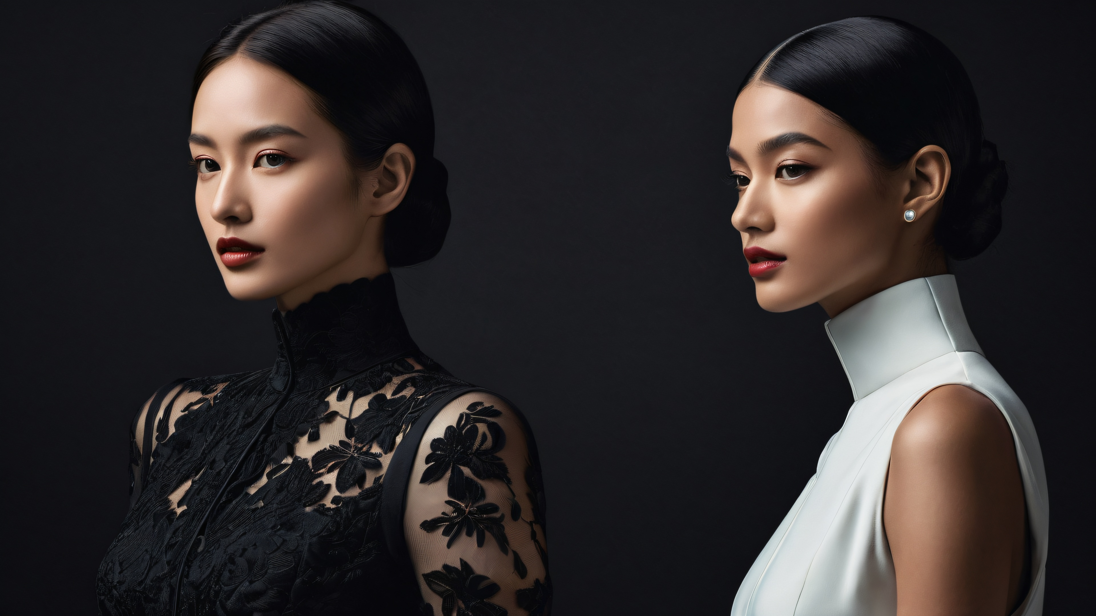 A breathtaking desktop wallpaper of Two Women, Perfectly clean vast pure void with extreme depth of field and a touch of whimsy, Award-winning digital art with pristine clarity and vibrant colors, Sleek dark mode aesthetic with deep perfect blacks, striking crisp contrast, and elegant luminescent accents, Bright and playful palette featuring pastel shades and bold accents, 16:9 aspect ratio, elegant low-key lighting, deep perfect blacks, striking contrast, sleek dark mode aesthetic, luminescent accents, deep rich colors, award-winning digital art, epic breathtaking scale, stunning visual impact, perfect composition, highly textured surfaces, intricate micro-details, physically based rendering, macOS wallpaper aesthetic, masterpiece, highest quality, highly detailed, 8k resolution.