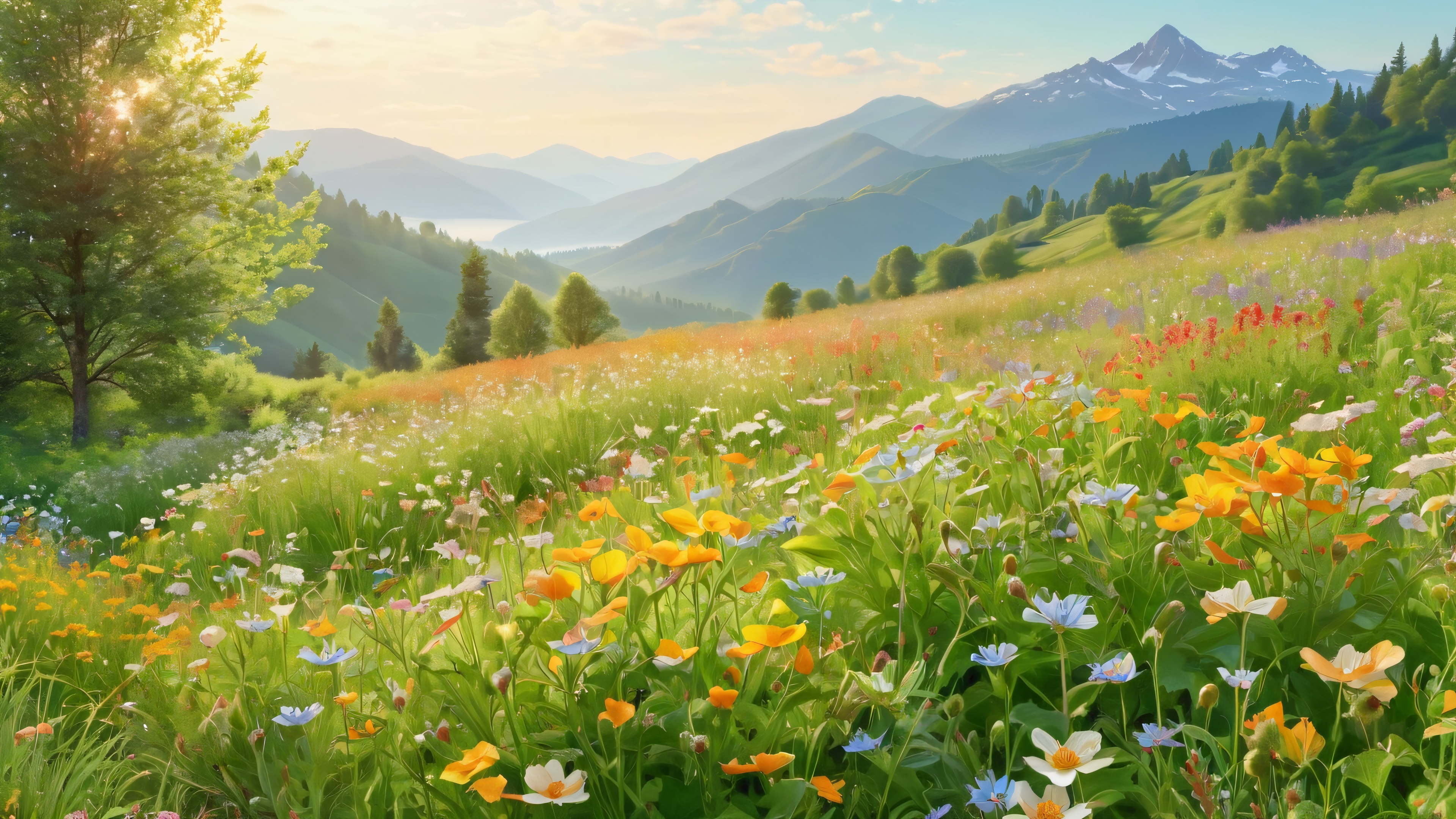 This stunning digital artwork depicts a vibrant, idyllic meadow with towering wildflowers that seem to sway in harmony. The surrounding landscape features rolling hills, towering trees, and distant misty mountains, all bathed in warm, soft natural light. The attention to detail is exquisite, with intricate patterns of sunlight filtering through the leaves and lush greenery sprawled across the scene.