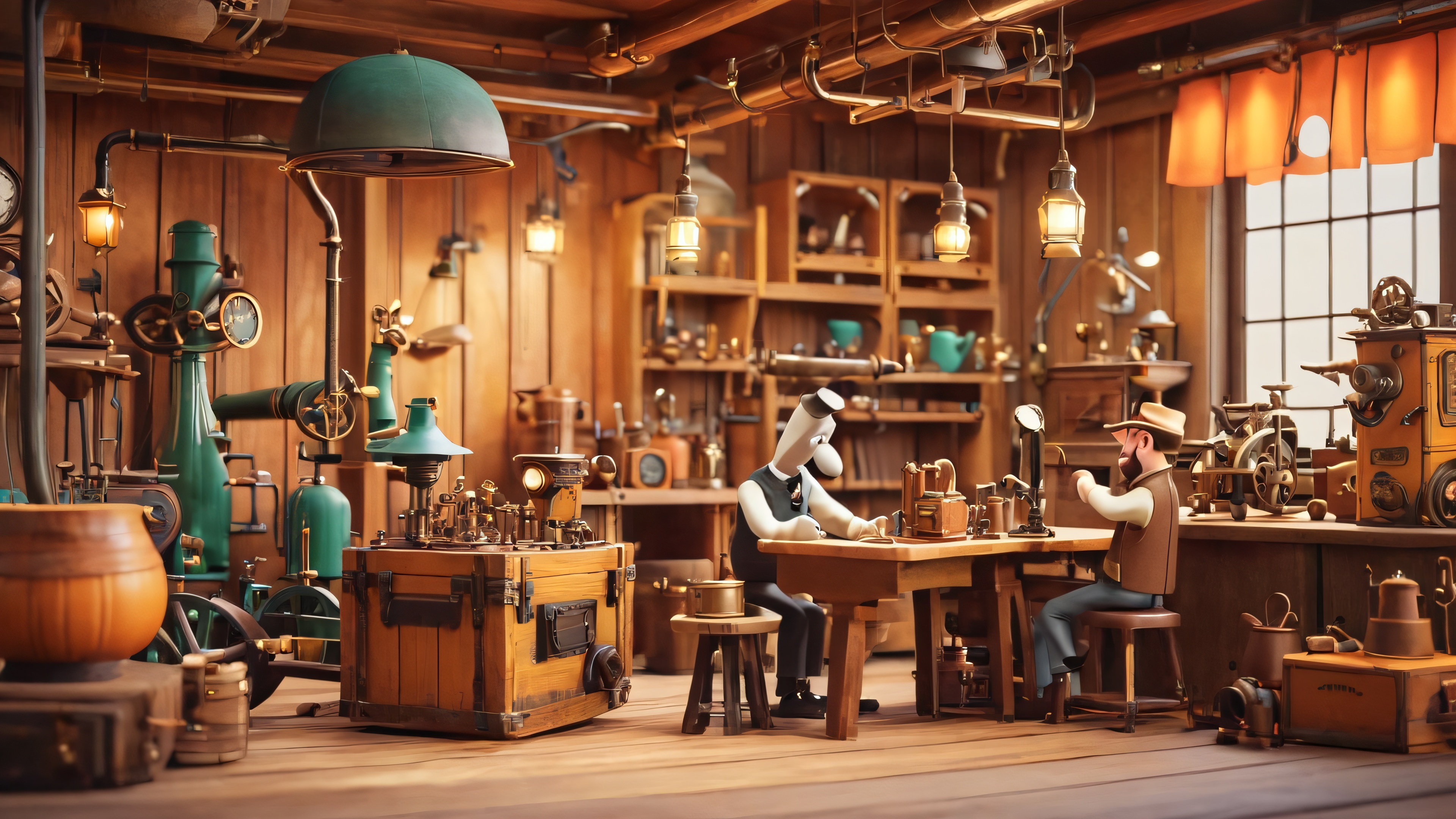 Intricate textures and subtle fabric wrinkles bring to life a cozy workshop scene. Whimsical characters, inspired by Aardman Animations, gather around a steampunk-inspired invention, surrounded by vintage machinery, wooden crates, and copper pipes. A warm, golden light from a nearby lantern casts a nostalgic ambiance, reminiscent of classic cartoons.