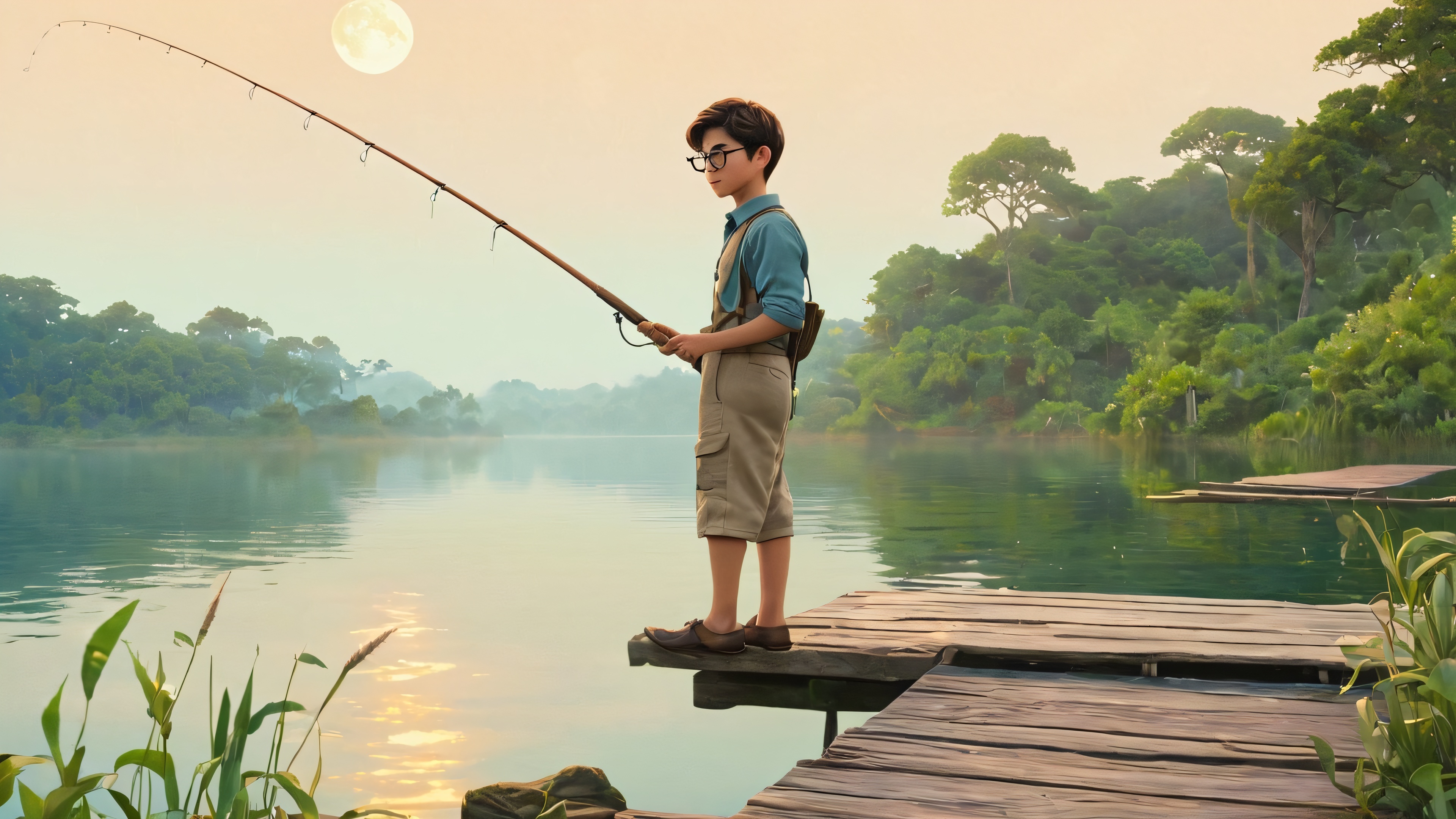 The 4K wallpaper features a young man dressed in a worn suit, holding a makeshift fishing rod and standing on the edge of a dilapidated wooden dock. The tension in his expression is palpable as he ponders the significance of the string wrapped around his fingers. The scene is set against a misty, moonlit lakefront, with creaking wooden piers overgrown with lush greenery and vines. Towering trees surround the dock, their branches leaning in as if sharing the young man’s dilemma. The illustration has a watercolor-inspired texture, with soft focus and subtle highlights on the string and the young man’s eyes. The scene is bathed in an ethereal glow, with deep shadows adding mystery to the scene. The muted palette features blues and greens, with warm undertones of golden light, accented by the soft pinkish hue of the moon and the vibrant greenery.