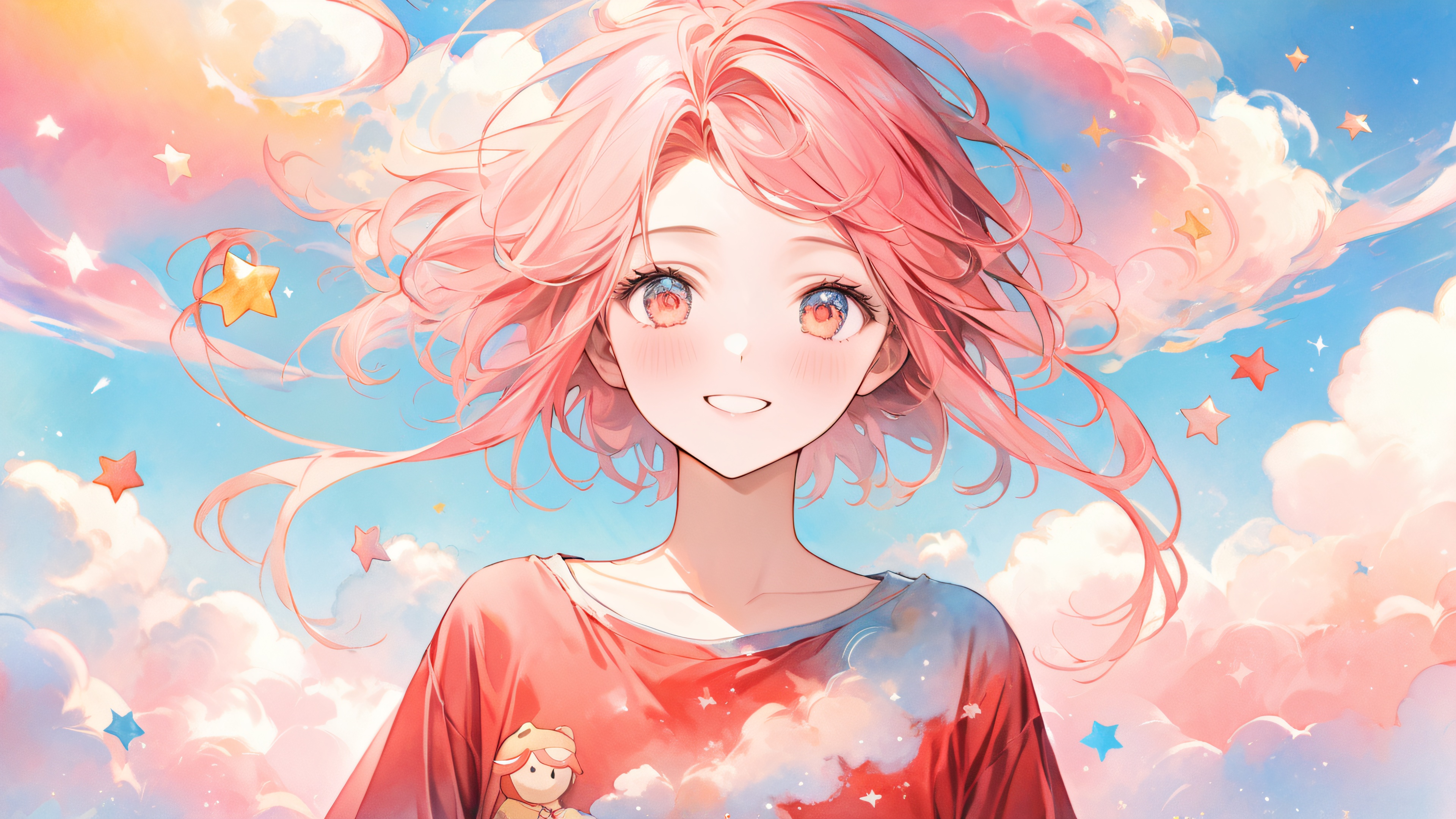 This 4K wallpaper features a young man with a gentle smile, wearing a whimsical red shirt with cartoon character designs, surrounded by dreamy, watercolor-inspired clouds and stars. The scene is bathed in a soft, golden light, with subtle texture and gradient effects adding depth and visual interest. The image is characterized by a palette of pastel pink, blue, yellow, and white, with pops of bright red from the shirt and cartoon characters, and a hint of creamy white from the clouds and the boy’s skin.