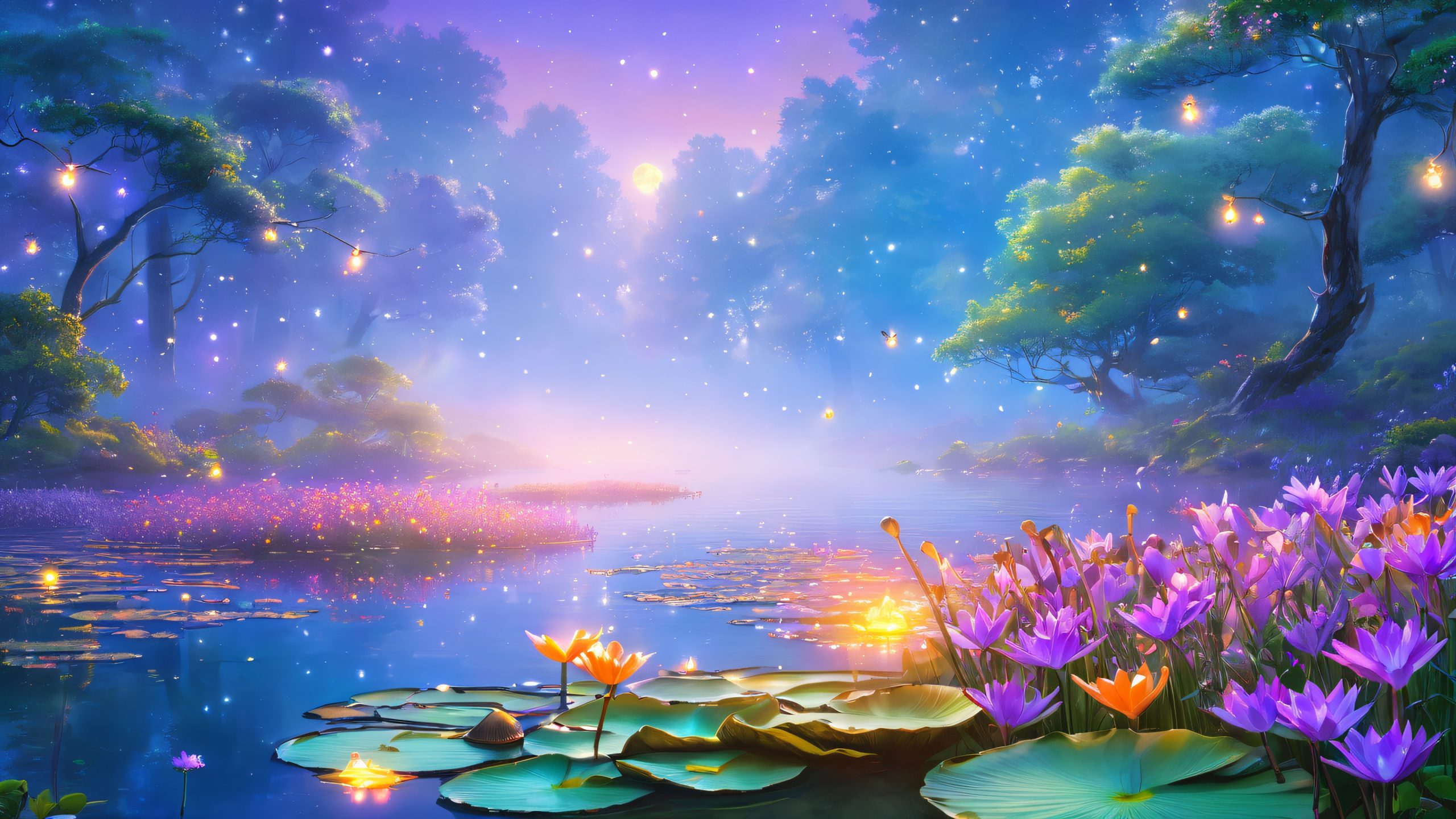 Serene lake desktop background with mystical forest and glowing mushrooms for your PC or Desktop