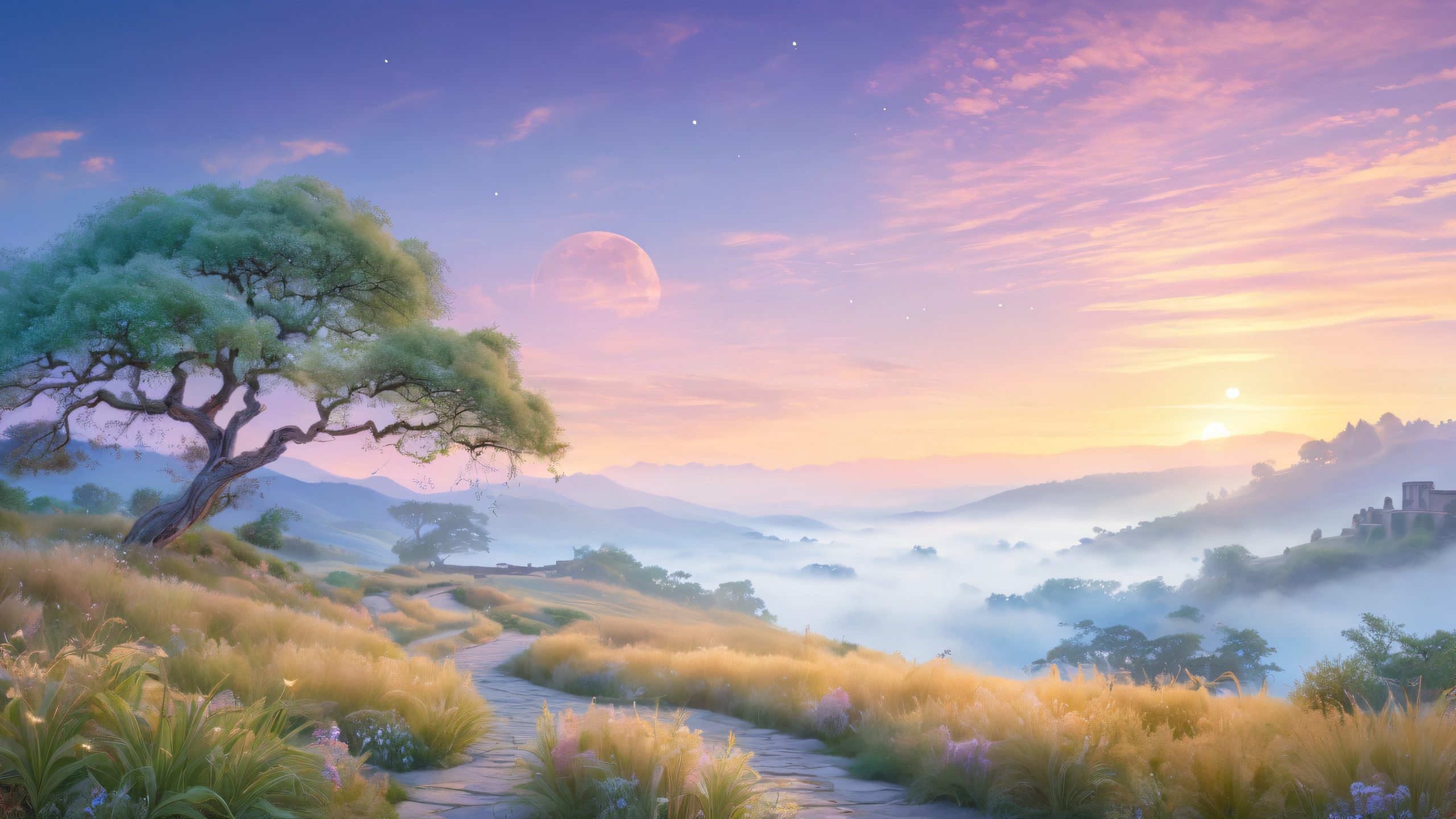 This enchanting 4K desktop wallpaper transports viewers to a mystical realm where whispering silk grasses roll gently across the terrain. Ancient trees bearing ethereal lanterns glow softly in shades of moonlit silver, while a misty veil rises from the horizon, carrying whispers of forgotten lore. Intricate stone pathways and ancient ruins are shrouded in mystique, with wispy tendrils of fog caressing the terrain like celestial fingers.