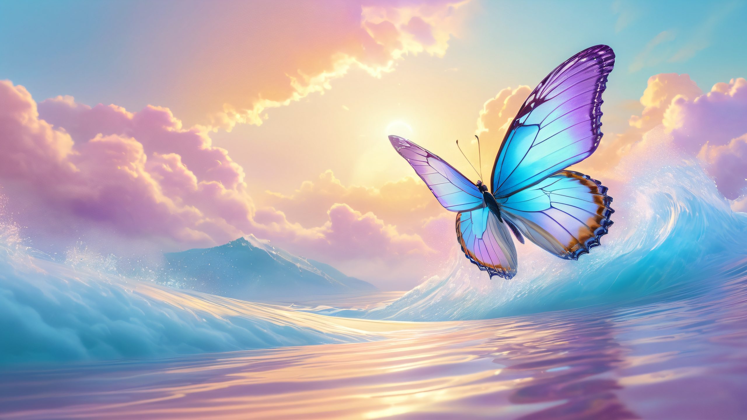 This captivating 4K digital painting features a majestic iridescent butterfly with delicate swirling patterns on its wings, gently emerging from a vast expanse of soft, glowing clouds. Wispy tendrils of mist seem to hold the essence of forgotten memories and whispered secrets. The whimsical landscape unfolds like a dream, with shimmering clouds, gentle hills, and subtle texture. Soft sunlight casts a warm golden glow, punctuated by shafts of luminescent light that pulse with an otherworldly energy.