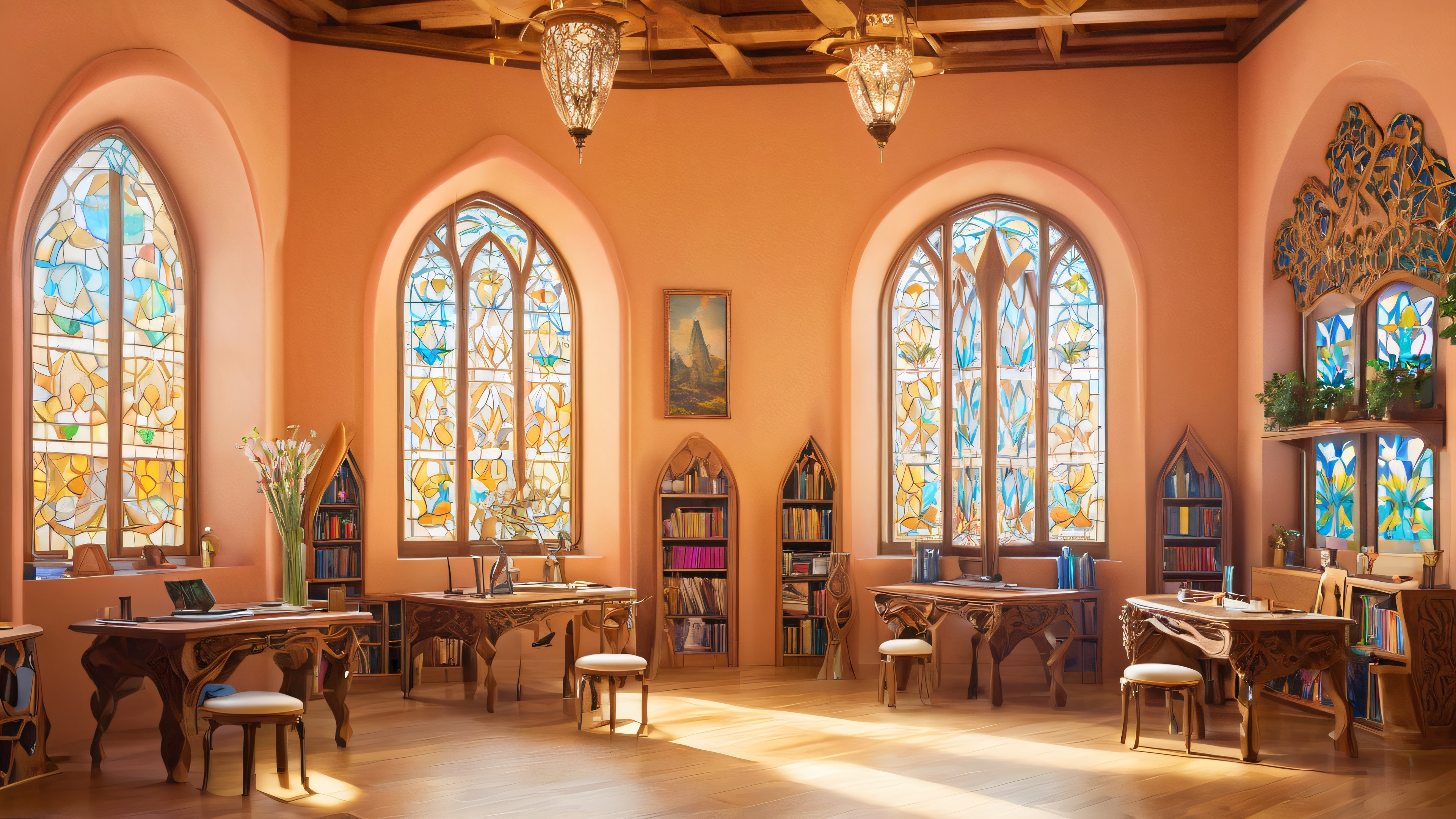 This enchanting scene depicts a mystical art classroom where students are surrounded by whimsical easels, floating paintbrushes, and canvases that pulse with an otherworldly energy. Warm golden light pours in through stained glass windows, casting an ethereal glow over the room as ancient magic simmers in the air.
