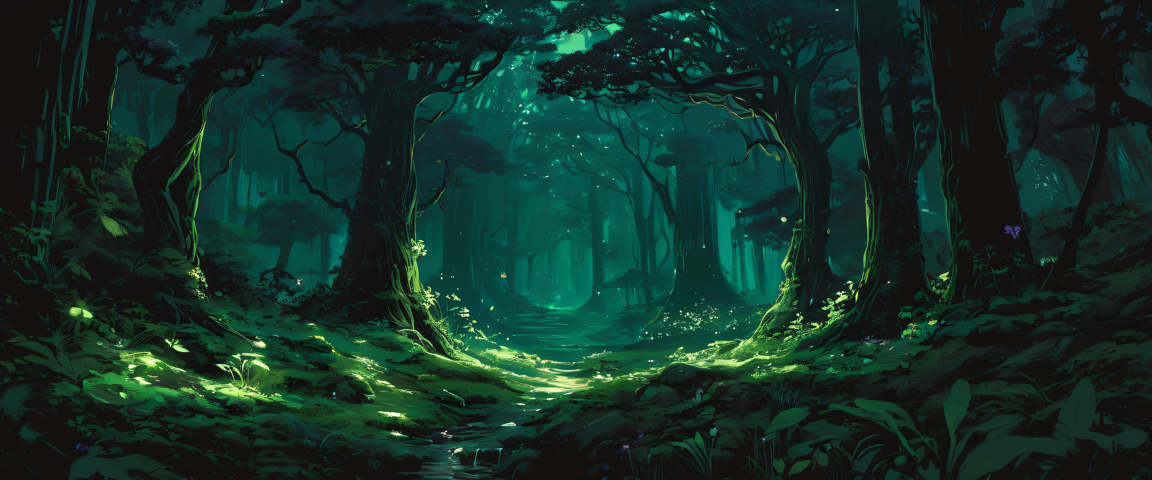 while luminescent mushrooms aglow with soft auroral light dot the forest floor.