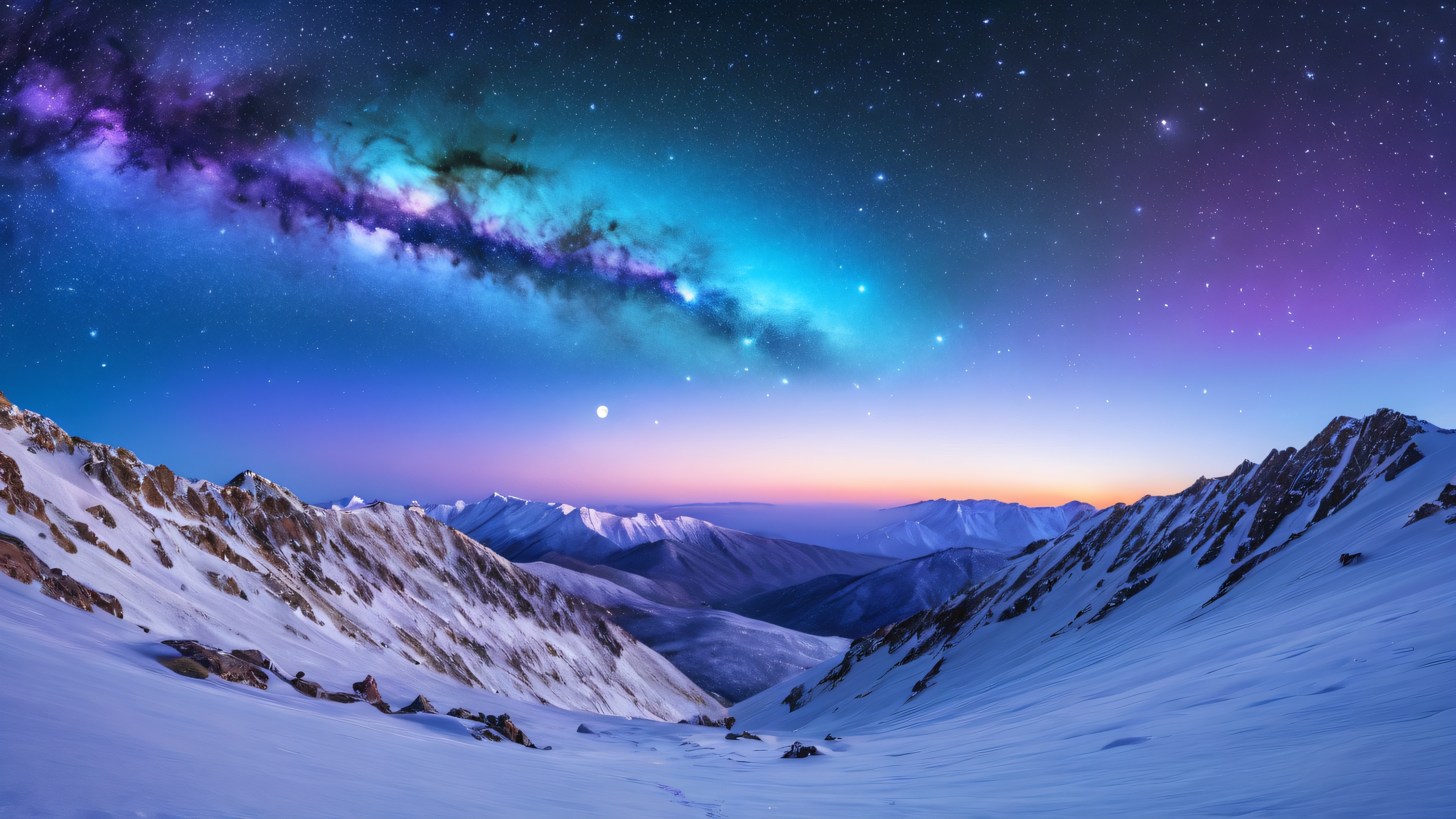This breathtaking 4k desktop wallpaper showcases a swirling vortex of star-forming gas and dust, illuminated by the faint, lunar glow of a distant moon. The rugged, snow-capped peak of Tajine Mountain rises in the distance, casting long shadows across its face. Dominant shades of icy blue, purple, and magenta evoke the majesty and mystery of the winter nebula, while subtle hints of green and gold add depth and dimension to this hyper-realistic, 3D-rendered scene.