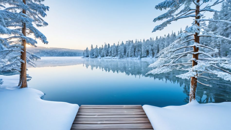 This breathtaking 4K desktop wallpaper captures a serene winter dock scene, with a small wooden dock stretching into the frozen lake, surrounded by snow-covered evergreen trees and a misty veil of winter fog. The dock’s weathered planks are worn smooth by the relentless cold, and the surrounding trees’ branches are etched in stark relief against the pale blue sky. The frozen lake’s snow-covered banks and scattered icebergs create a serene atmosphere, while the surrounding evergreen trees, their branches heavy with snow, stretch out in a gentle arc. The soft, diffused natural light casts a gentle glow, with the dock’s wooden planks taking on a warm, golden tone from the reflected light.