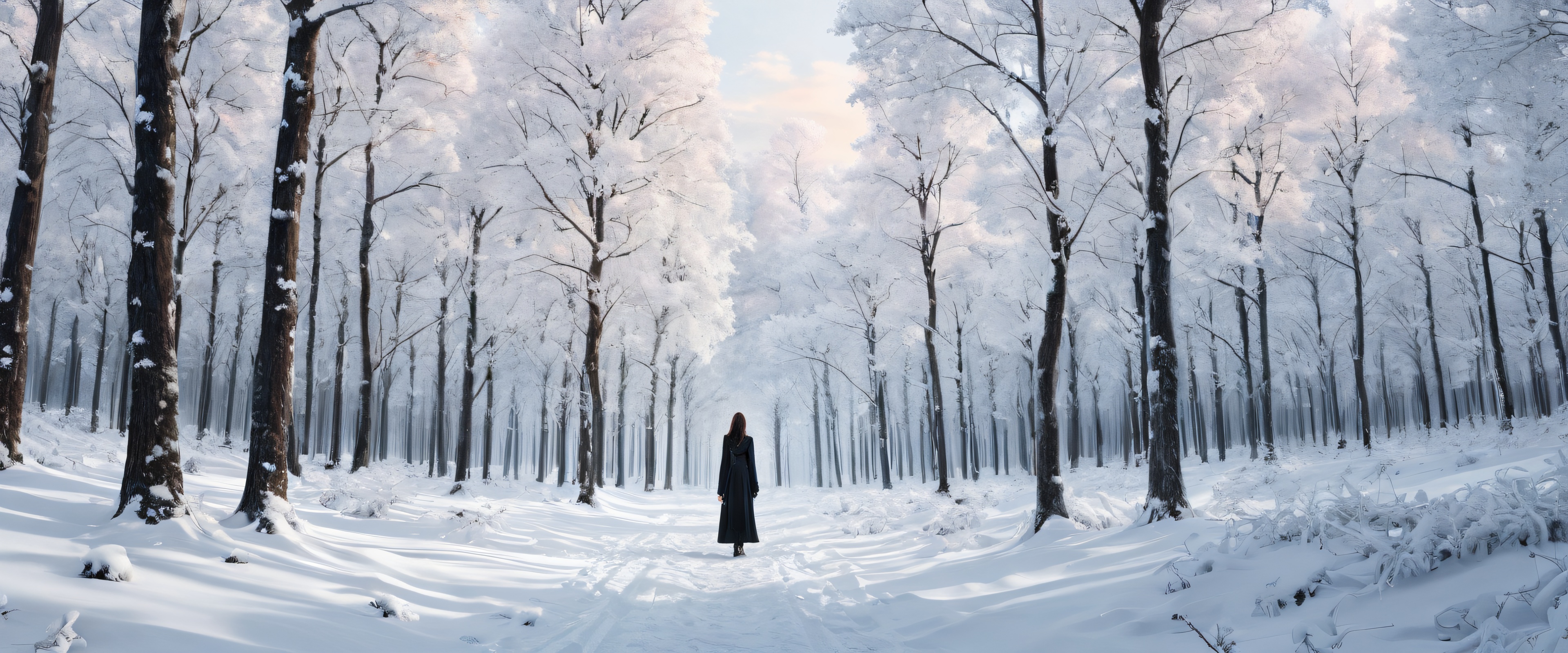 A breathtaking desktop wallpaper of Solitary Woman, Desolate winter forest with a perfectly clean vast pure void, extreme depth of field., Award-winning digital art with pristine clarity, blending cinematic flair and moody atmosphere., Ethereal lighting with radiant brilliant colors, ray-traced reflections, and pristine clarity. Bright and airy, evoking a sense of melancholy., [‘Black’, ‘White’], 21:9 ultrawide panoramic aspect ratio, epic wide shot, ethereal lighting, radiant, brilliant colors, ray traced reflections, pristine clarity, award-winning digital art, epic breathtaking scale, stunning visual impact, perfect composition, highly textured surfaces, intricate micro-details, physically based rendering, macOS wallpaper aesthetic, masterpiece, highest quality, highly detailed, 8k resolution.