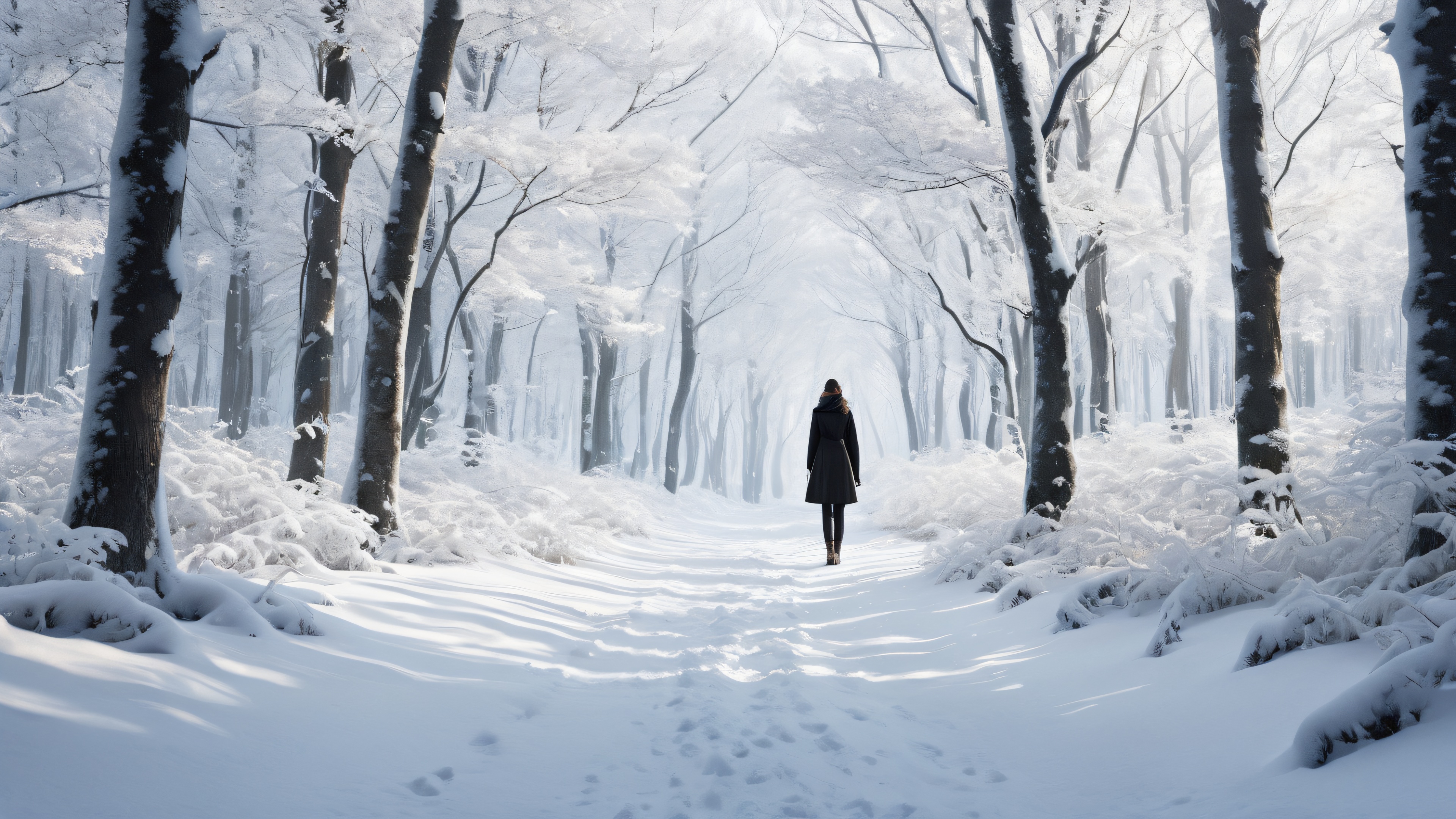 A breathtaking desktop wallpaper of Solitary Woman, Desolate winter forest, perfectly clean vast pure void, extreme depth of field, Award-winning digital art, pristine clarity, cinematic film grain, Ethereal lighting with radiant brilliant colors, ray traced reflections, and pristine clarity. Bright and airy., [‘Black’, ‘White’], 16:9 aspect ratio, ethereal lighting, radiant, brilliant colors, ray traced reflections, pristine clarity, award-winning digital art, epic breathtaking scale, stunning visual impact, perfect composition, highly textured surfaces, intricate micro-details, physically based rendering, macOS wallpaper aesthetic, masterpiece, highest quality, highly detailed, 8k resolution.