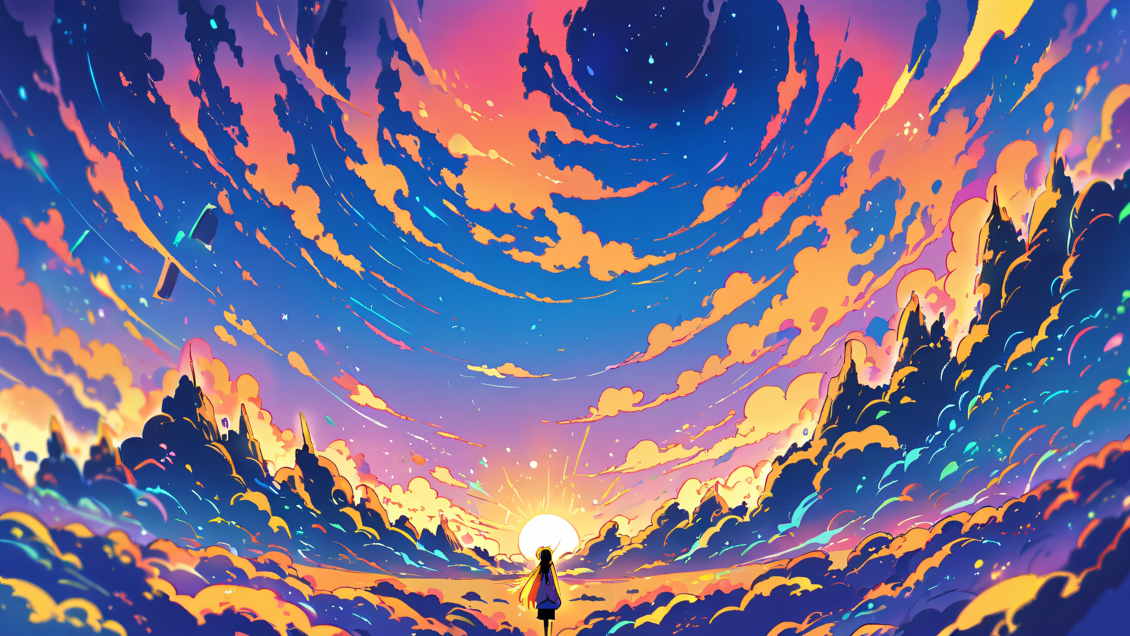 This masterpiece features a breathtakingly beautiful void with an astonishing depth of field, allowing the viewer’s gaze to effortlessly get lost in the vibrant colors. The starred sky at sunset adds a touch of ethereal lighting, making this anime illustration truly stunning. Perfectly clean and bright, this wallpaper invites you to escape into its vivid world.